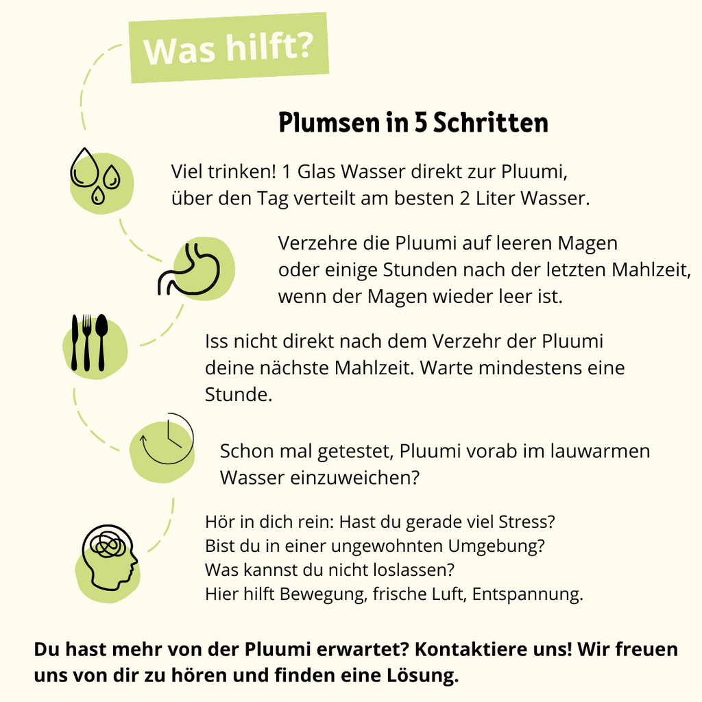 Du kannst 1–2 Pluumis täglich direkt verzehren – ideal morgens oder abends auf nüchternen Magen. Alternativ kannst Du sie in lauwarmem Wasser ca. 1 Stunde einweichen und das Wasser trinken. Danach einfach das Fruchtfleisch lutschen und ein Glas Wasser nachtrinken.