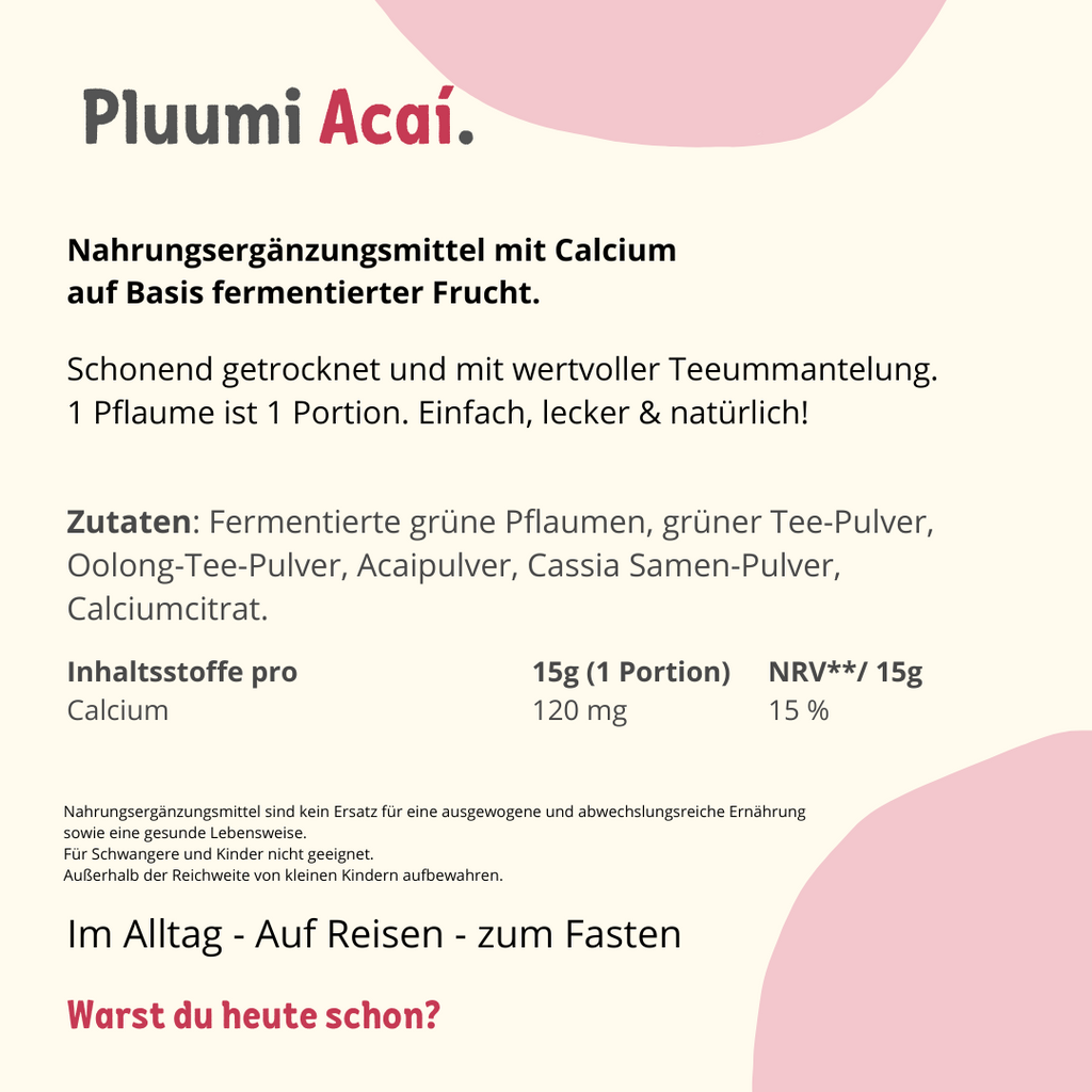 Pluumi Acai ist ein natürliches Nahrungsergänzungsmittel mit Calcium auf Basis fermentierter Pflaume, kombiniert mit hochwertigem Acai-Pulver. Es verbindet jahrhundertealte Fermentationstradition mit den Vorteilen eines modernen Superfoods.